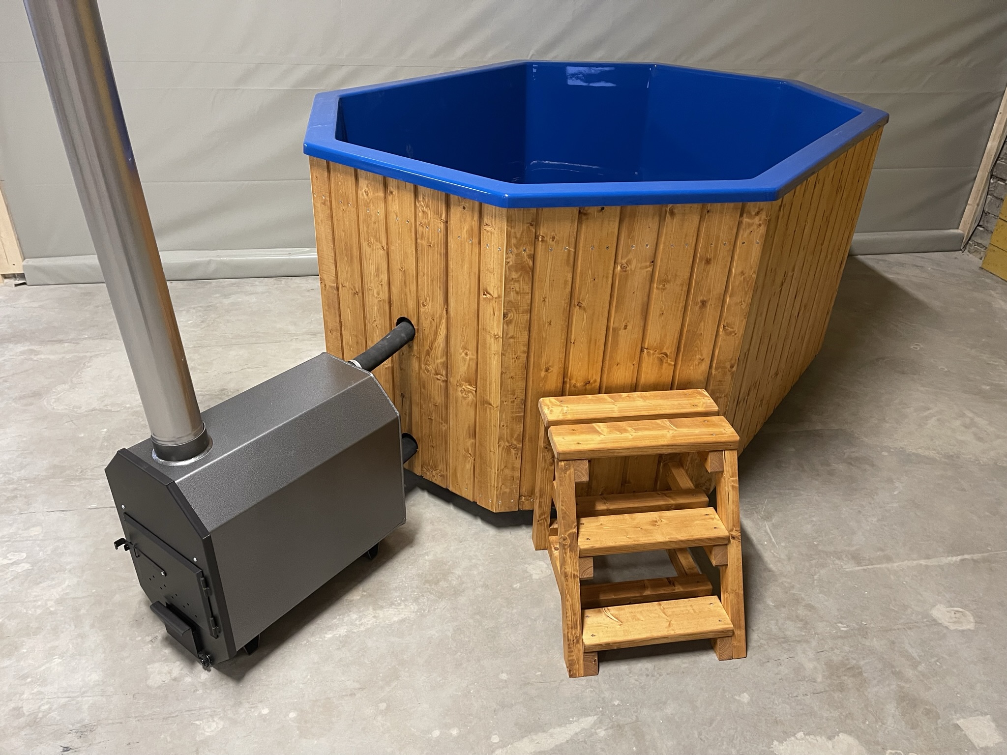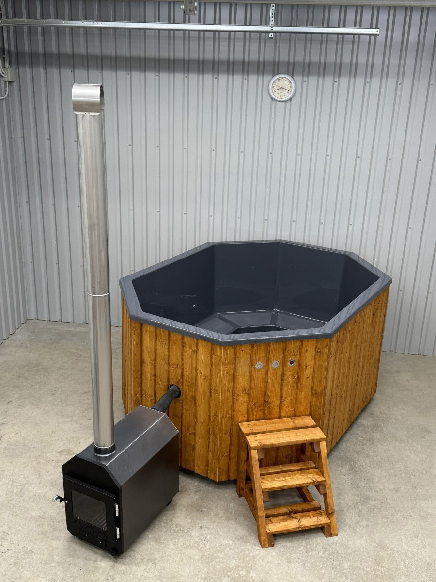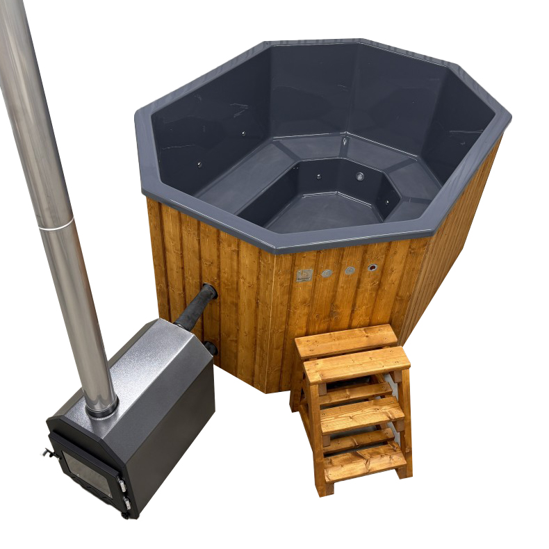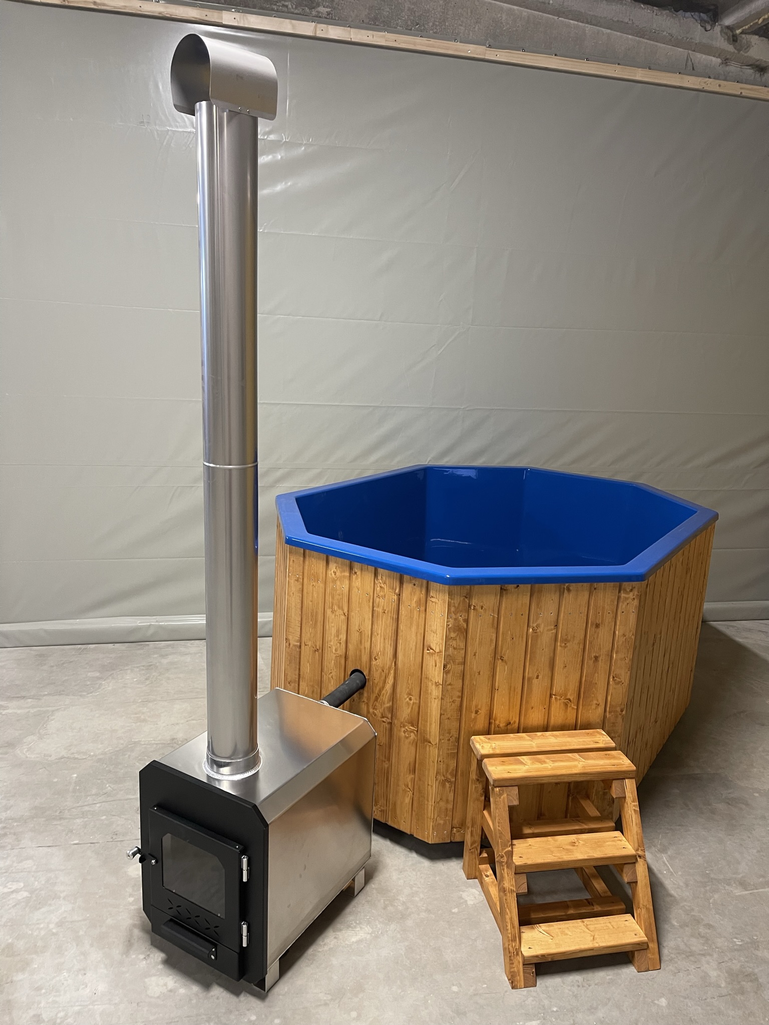 В комплект входит вставка из стеклопластика, деревянный корпус, дерево обработано маслом, нижние полки, 2 обода из нержавеющей стали, уличная печь из морского алюминия с дымоходом длиной 2 м, слив с краном и лестница.