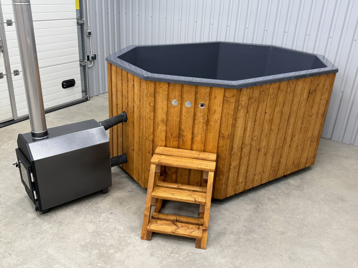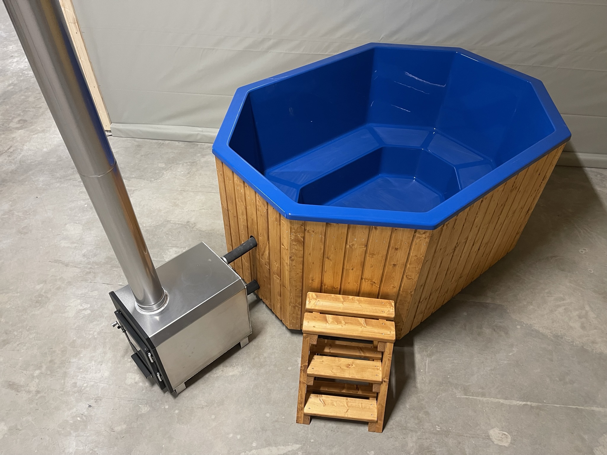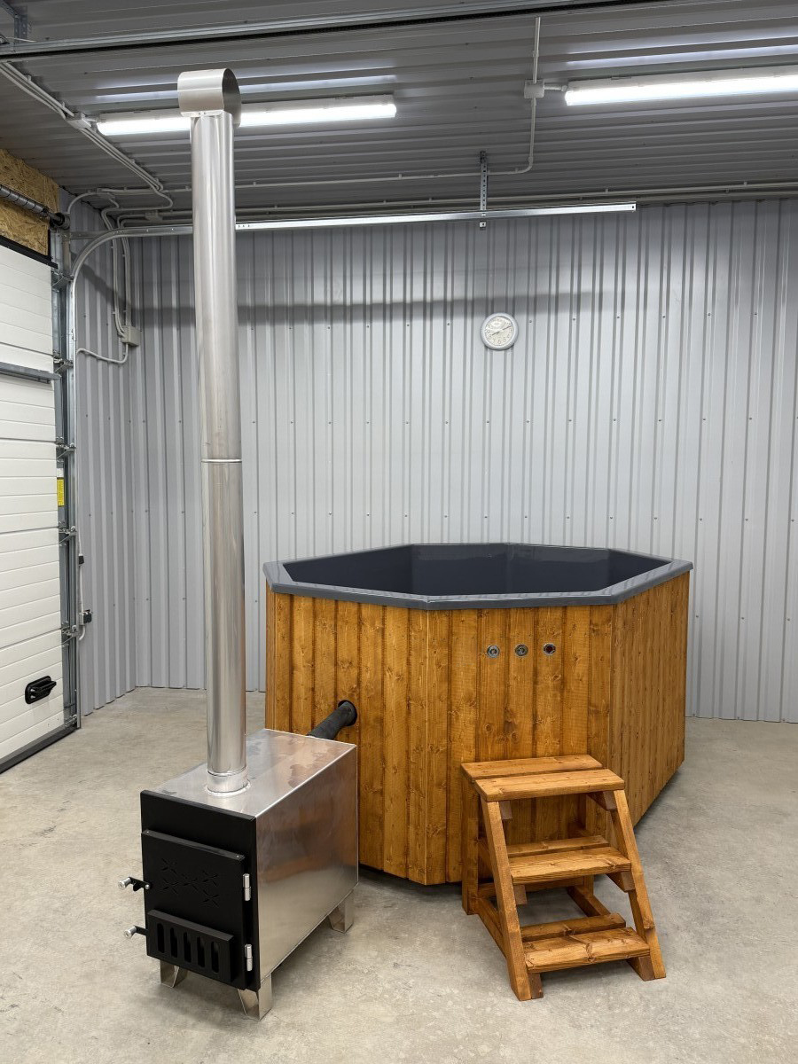 В комплект входит вставка из стеклопластика, деревянный корпус, дерево обработано маслом, нижние полки, 2 обода из нержавеющей стали, уличная печь из морского алюминия с дымоходом длиной 2 м, слив с краном и лестница.