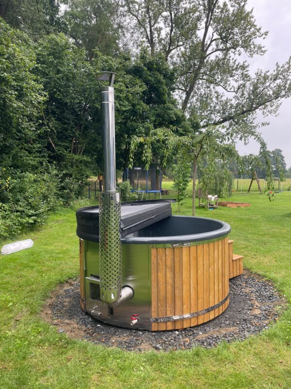 Купель 200cm с Наружной печью СТАНДАРТНАЯ КОМПЛЕКТАЦИЯ ВКЛЮЧАЕТ: Печь из нержавеющей стали AISI 304 Комплект дымохода Деревянная отделка Стандартная лестница